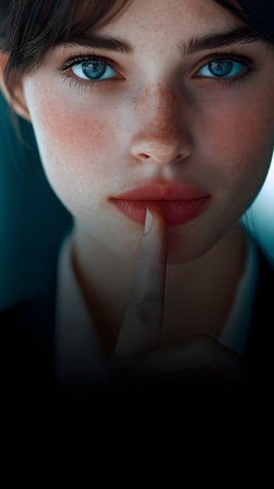 Close up portrait of a beautiful young woman with blue eyes holding her finger to her lips