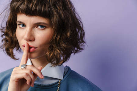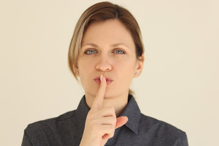 Portrait of pretty, charming, mysterious, sexy, attractive woman holding forefinger on mouth, asking to keep silence