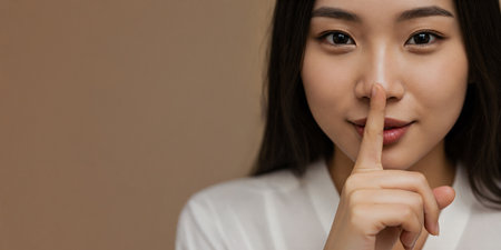 Smiling Asian Woman Holding Finger to Lips in Quiet Gesture, Blending Playfulness, Calm, and the Power of Silent Expression