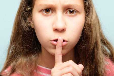 silence and quiet. little girl shushing the viewer. finger on lips. facial expression.