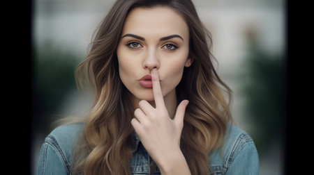 Will you keep my secret Confused young woman keeping index finger on her lips while standing against grey background : Generative AI