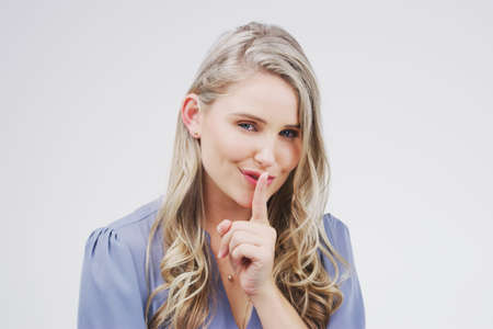 Close up of young blonde woman showing silence gesture with finger on her lips.