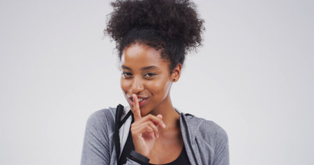 Shell never tell. Studio shot of a beautiful young woman with her finger on her lips in artistic lighting.