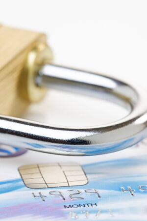 Lock with credit card. Safe shopping and protected paying concept