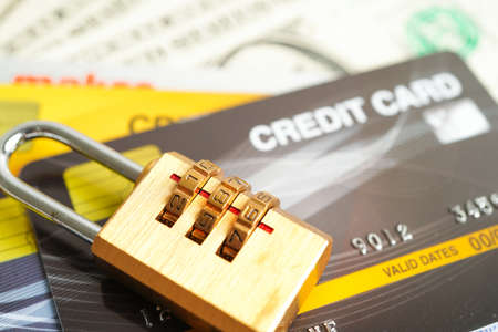 Credit card with password key lock, security finance business concept.