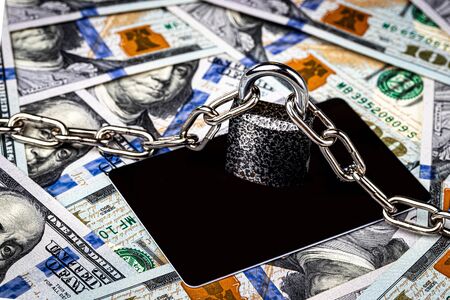 Dollar bills, lock with metal chain and black debit card. The concept of virtual money and commerce blocking or safety.
