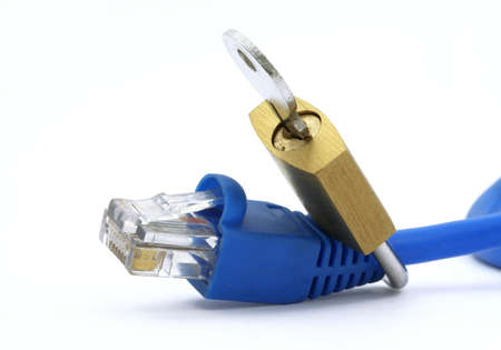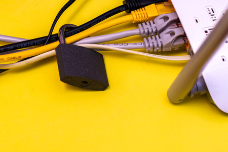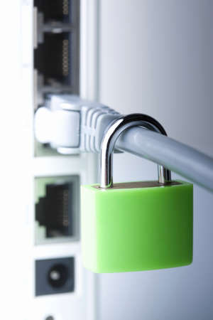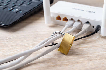padlock on internet cables coming out of the modem concept information protection cybersecurity censorship on the Internet. High quality photo