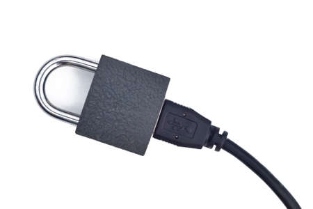 Computer or internet security. Data protection concept: usb cable, lock and laptop in the background.