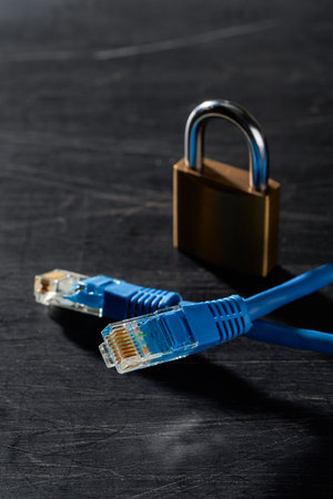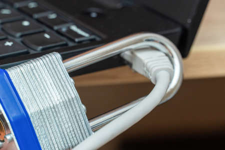 padlock on an internet cable connected to a laptop concept data protection cybersecurity. High quality photo