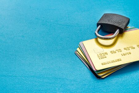 Credit card security concept with lock on blue desk copy space