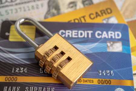 Lock with credit card. Safe shopping and protected paying concept