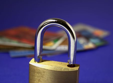 a padlock in front of several credit cards, shallow depth of field and focus on the padlock