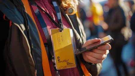 Person holding a smartphone with a large identification badge at a busy outdoor event