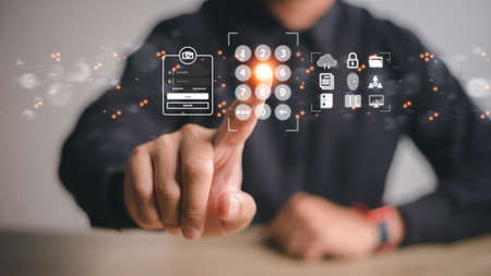 A businessman with a mobile phone is secure in his account. The concept is hacking a Phishing mobile phone with a password to access a smartphone, security threats online, and fraud.