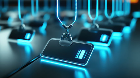Modern black tags with clean lines and glowing neon highlights, attached to products in a high-tech retail environment.