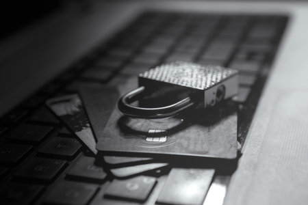credit card with security lock on black desk top view
