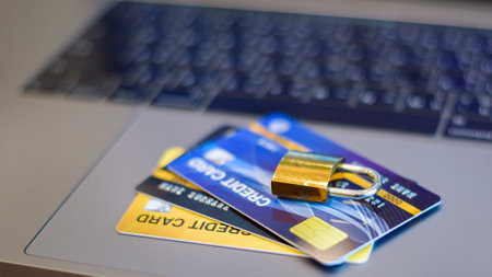 padlock with keys on a credit card on a yellow background data protection concept deposit protection. High quality photo