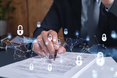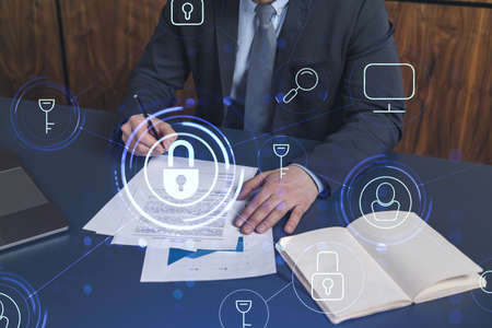 A businessman in formal wear signing the contract to prevent probability of risks in cyber security. Padlock Hologram icons over the working desk.