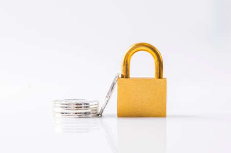 Money and Security Concept. Closeup of wooden master key lock icon with stack of silver coins on white background.