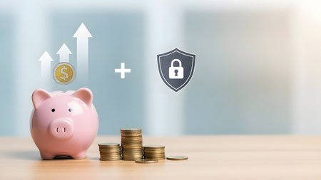 This image represents secure financial growth, showing a piggy bank, rising charts, and a shield.