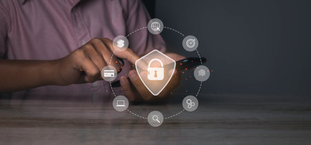 Cybersecurity and privacy concepts to protect data. Lock icon and internet network security technology. Businessmen protecting personal data on smartphone and virtual interfaces.