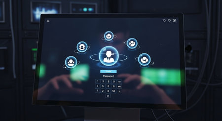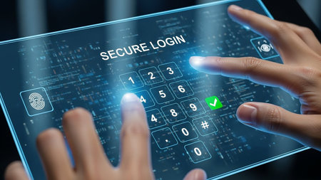 Hands are shown entering a secure login code on a digital keypad displayed on a futuristic screen, with a fingerprint icon present.