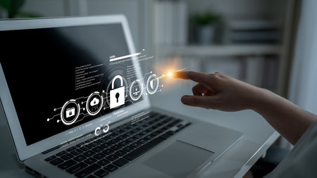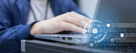 Person using a Laptop Computer with data protection, Cyber security secure, information safety and encryption concept. internet technology and business concept, Laptop mockup on screen.