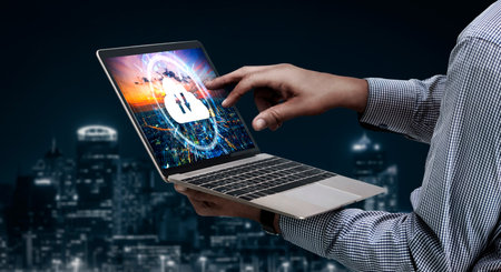 Person using laptop and touching virtual screen for two-factor authentication for safety use of social networks and access to information privacy
