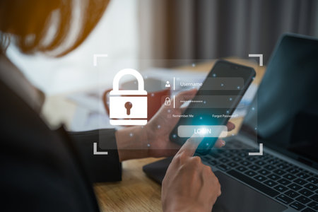 Businesswoman use mobile phone and laptop to access, information security and encryption, secure access user's personal information, Internet access, cybersecurity. Cyber security technology concept.