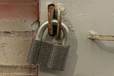 Iron lock on gray painted iron door, security gate shutter