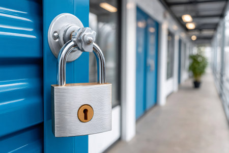 Metal padlock securing a blue storage unit door in a long hallway, providing security and protection