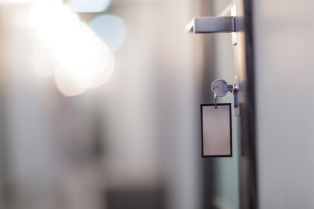 Close-up of a key inserted in a modern door lock with blank key tag, symbolizing security and access.