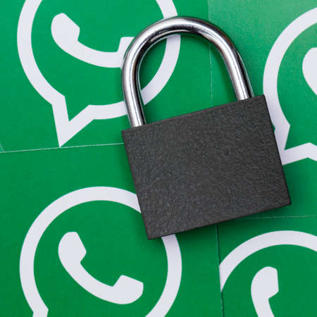 LONDON, UK - MARCH 29 2017: WhatsApp social media logo with a security padlock