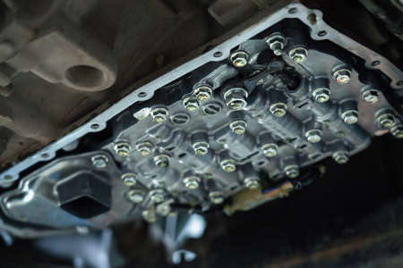 CVT gearbox close up, changing oil in modern automatic transmission on SUV in Car Service.