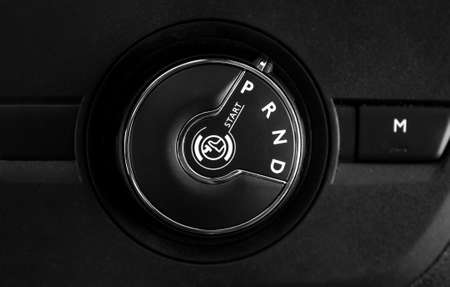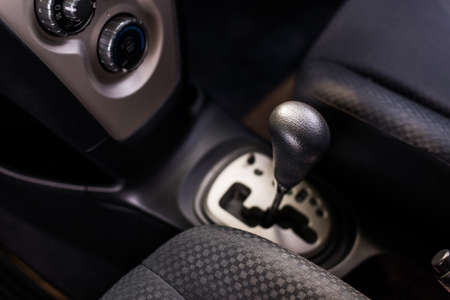 Automatic gear knob in the passenger compartment in black for driving and acceleration. Abstract image of fast speed.