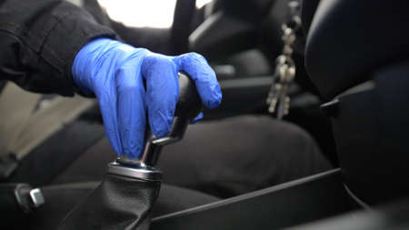 Close up view of a gear lever shift. Manual gearbox. Car interior details. Car transmission. Soft lighting. Abstract view