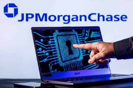 Kazan, Russia - Nov 24, 2021: Laptop with lock symbol on screen on background of JPMorgan Chase bank logo. Finger points to lock symbol. Concept of data hacking.