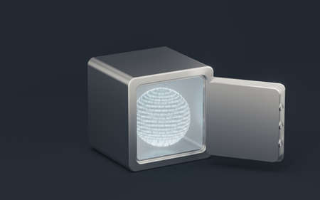 3d rendering of a safe with binary code on the background.