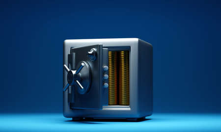 Safety box with coins on blue background. Bank security. Copy space. 3D illustration.
