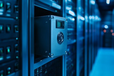 A close-up view of a black network security device with glowing blue cables connected to it