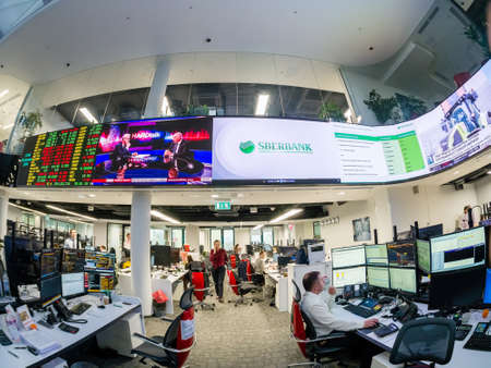 MOSCOW, RUSSIA - JAN 30, 2018: View to busy trading floor of the Sberbank CIB stock exchange in Moscow on Jan 30, 2018. It is the new largest trading floor in Europe with 4000 square meters area.