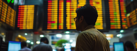 Investor analyzing market trends in a busy financial trading room during evening hours with illuminated stock boards