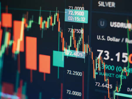 Stock market candlestick chart, asset prices movement, currency exchange price action simple concept. Computer screen, display, candle chart, graph detail, extreme closeup, nobody, no people