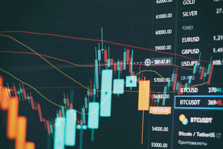 Stockmarket online trading chart candlestick on crypto currency platform. Stock exchange financial market price candles graph data pattern analysis concept. Computer screen closeup background