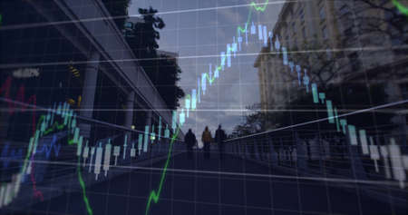 Image of financial graphs and data over cityscape. global finance, economy and technology concept digitally generated image.