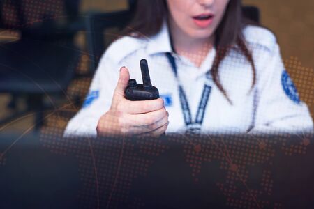 Security guards working in surveillance room. Female security guard with portable transmitter monitoring cameras indoors at night.