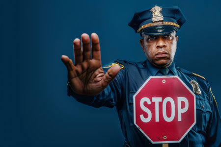 A police officer is standing in front of a blue wall and holding his hand up in a stop sign gesture