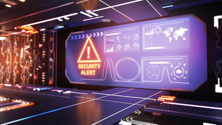 Security alert hologram intro on dynamic background. Modern and futuristic concept of cyber attack, computer security, warning sign and digital protection 3d illustration.