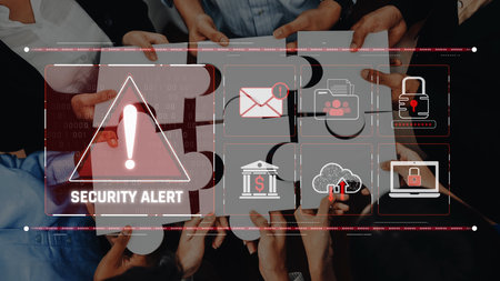 A dynamic visual representation of a security alert featuring puzzle pieces and icons related to data protection and digital safety in a collaborative business environment. Raster
