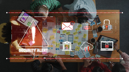 A diverse team collaborates on analyzing a security alert using digital devices and charts, showcasing strategic communication and teamwork in a vibrant office environment. Raster